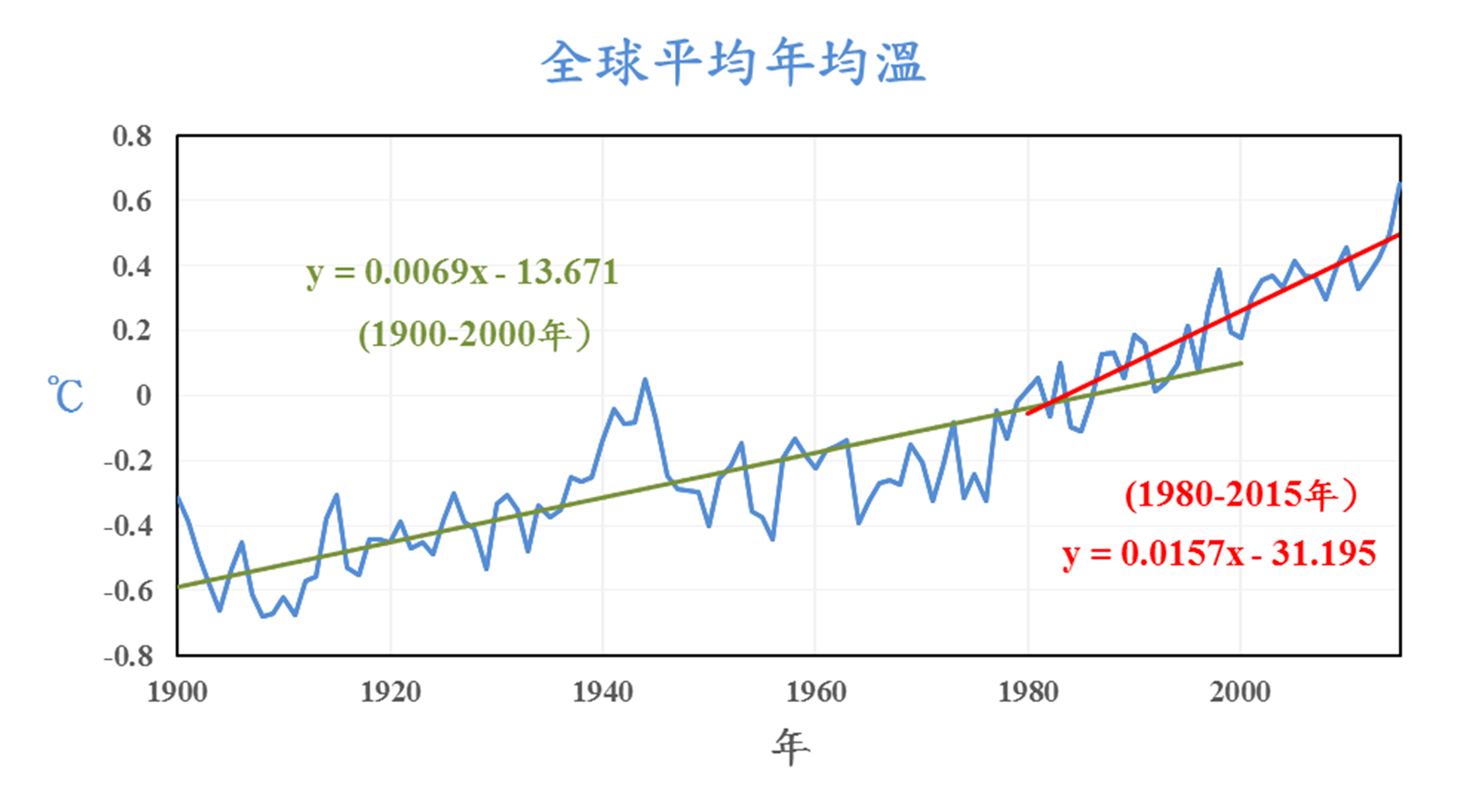 ▲全球平均溫度(包含陸地與海洋)於1900-2015年間,相對1971-2000年平均值之變化值與暖化趨勢。
