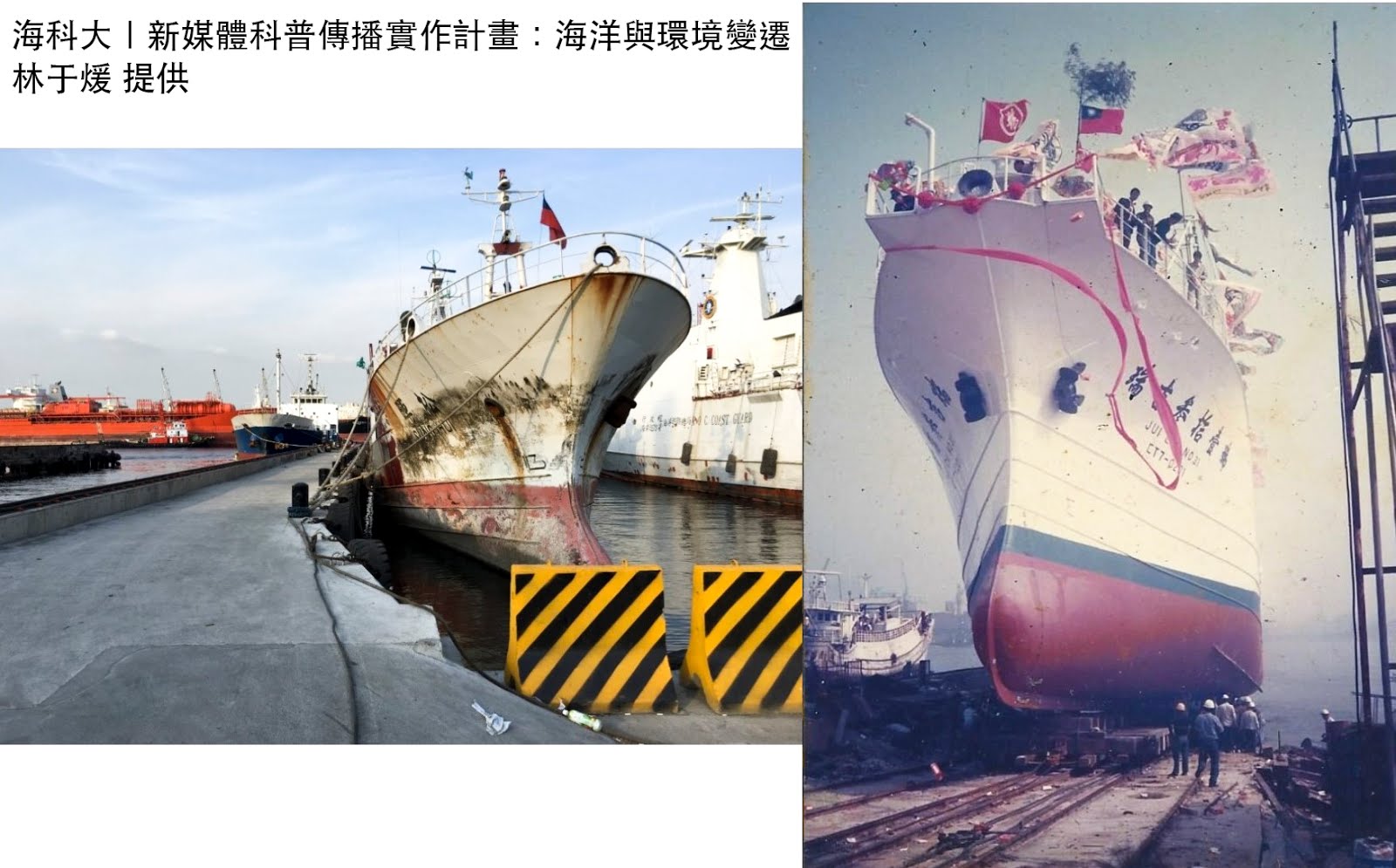 ▲右方為昇航造船廠早期的曳船道上的一景,台車上的漁船即將下水。左方為昇航造船廠現今的樣貌,原本的曳船道及其上的軌道、船台等設備已被撤除,改成供船隻停靠的出租碼頭。