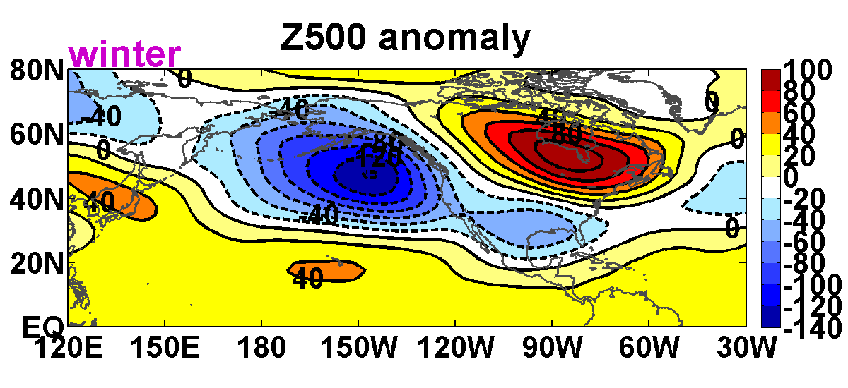 ▲聖嬰現象於冬季所引發自熱帶影響中緯度之大氣遙相關環流型態。